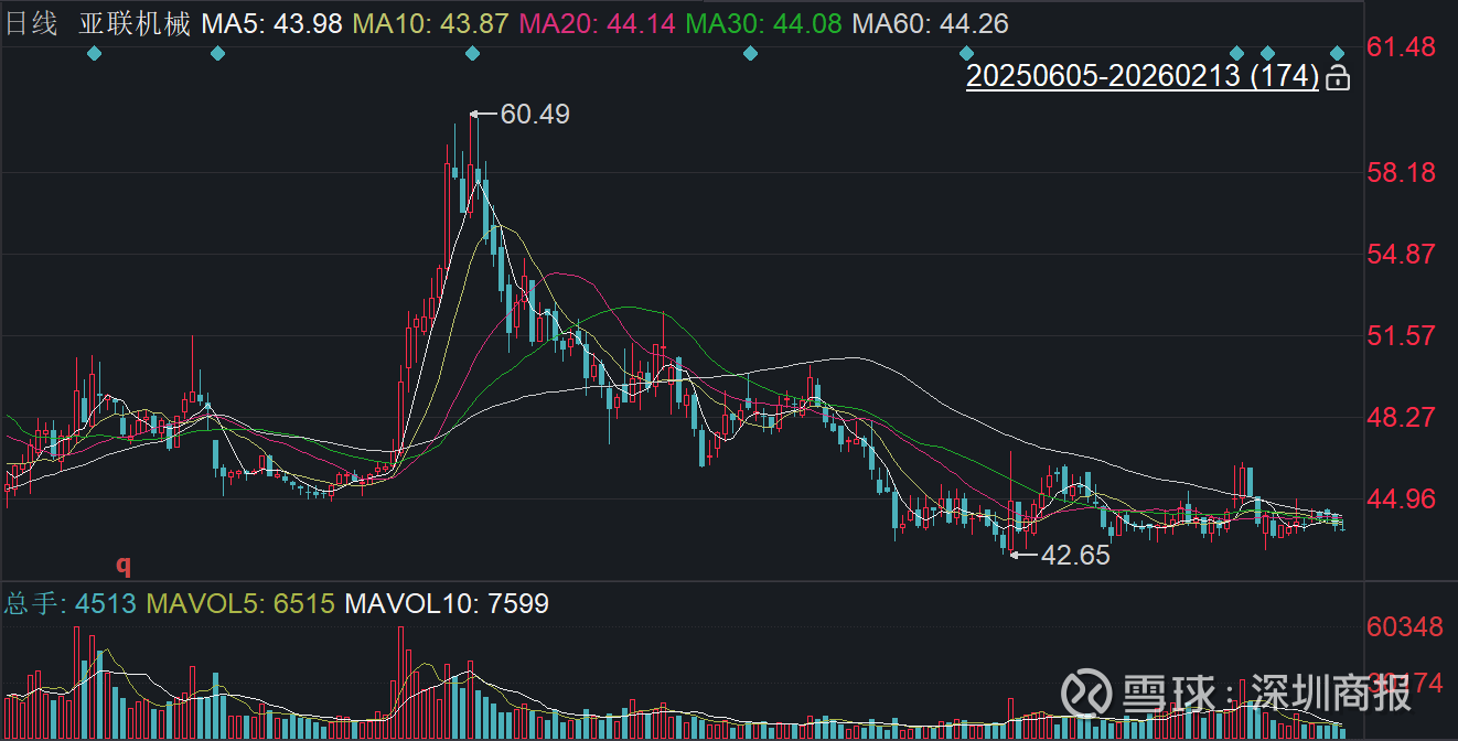 二级市场上,截至2月13日收盘,亚联机械下跌0.34%报43.65元/股,总市值约38.08亿元,上市以来累计上涨约132%,但较2025年8月的高位跌超两成,股价如“过山车”。