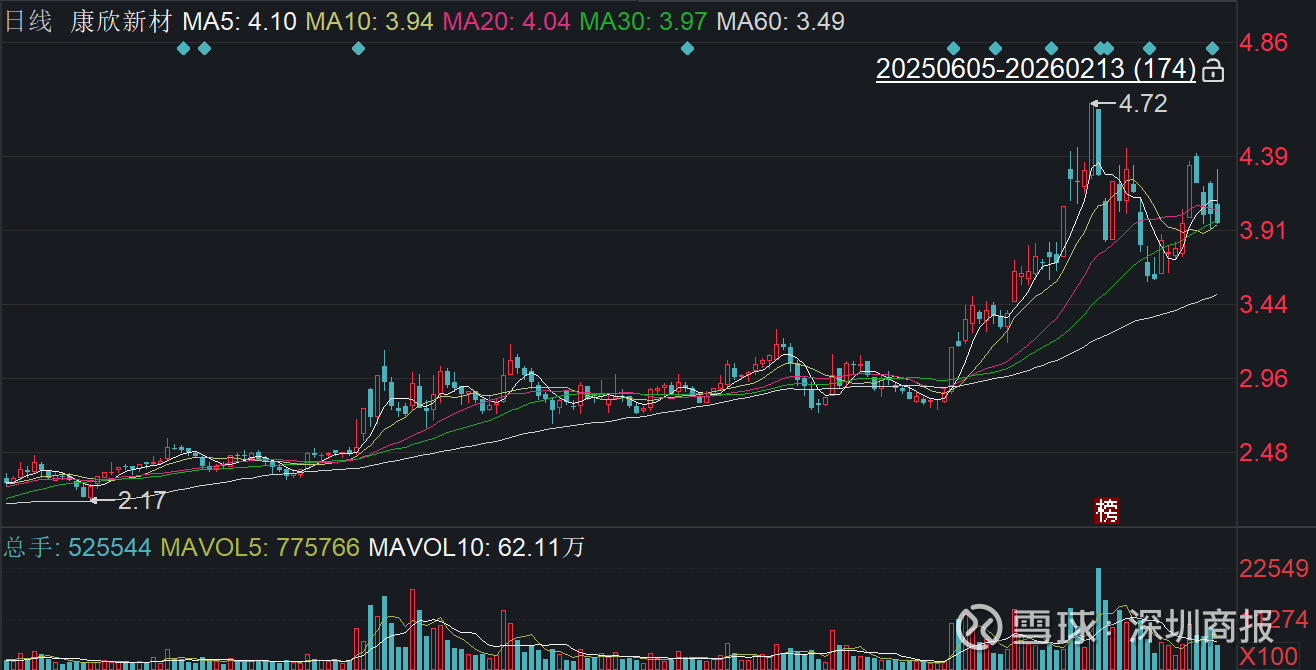 二级市场上,截至2月13日收盘,康欣新材下跌1.50%报3.95元/股,总市值约53.11亿元,近一年以来累计上涨约94%。
