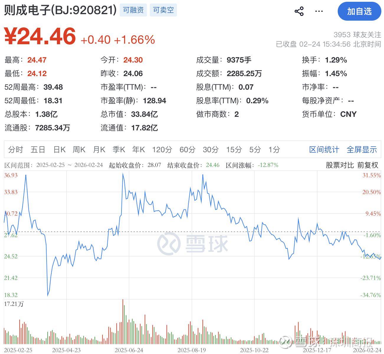 二级市场上,截至2月24日收盘,则成电子上涨1.66%报24.46元/股,总市值为33.84亿元。
