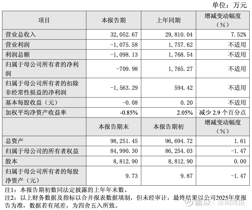 报告期内,公司实现基本每股收益-0.08元,较上年同期减少0.28元。报告期末,公司总资产98,251.45万元,较上年同期增加1.61%;归属于母公司的所有者权益84,990.30万元,较上年同期减少1.47%;归属于母公司所有者的每股净资产9.73元,较上年同期减少1.47%。