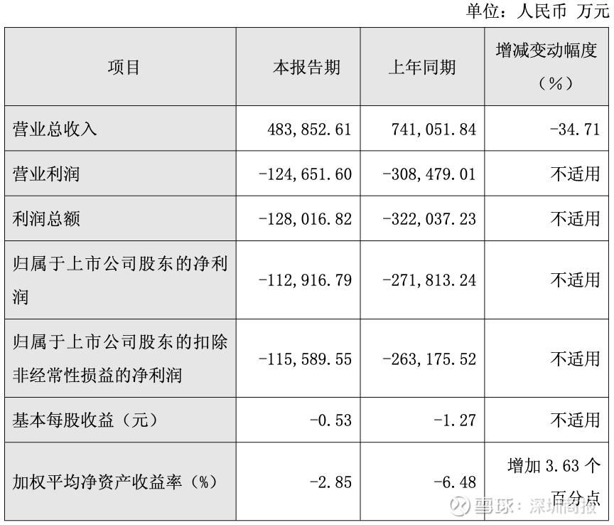 营业总收入较上年同期减少34.71%,营业利润、利润总额、归属于上市公司股东的净利润、归属于上市公司股东的扣除非经常性损益的净利润、基本每股收益均为亏损,但亏损规模较上年同期大幅收窄,主要系报告期内生产成本的降低与运营效率的提升所致。