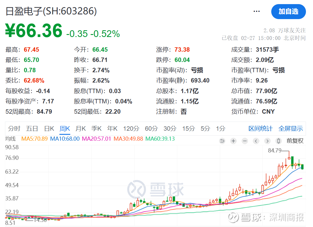 读创财经观察到,自去年4月起,日盈电子因涉及人形机器人“电子皮肤”概念而备受资本追捧,吸引了数十家机构密集调研。受此利好刺激,公司股价一路高歌猛进,从去年5月初的34.4元/股起步,至今年1月21日冲高至84.79元/股,区间涨幅突破140%。
