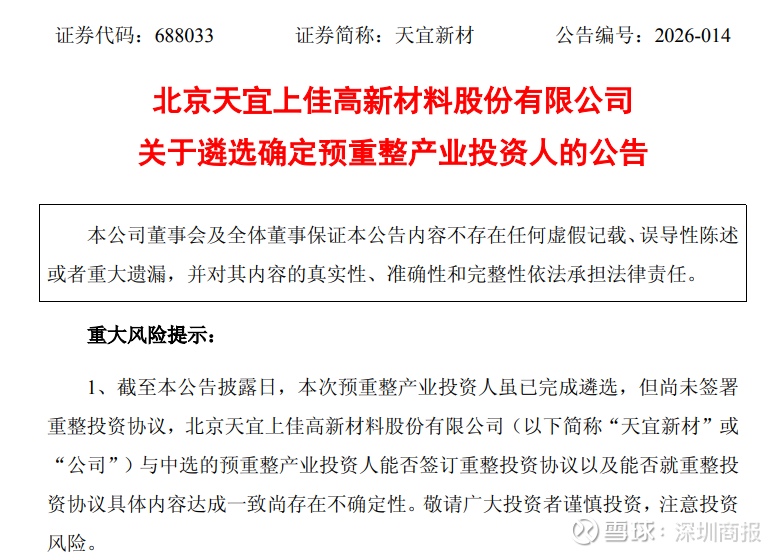 公告显示,截至公告披露日,天宜新材本次预重整产业投资人虽已完成遴选,但尚未签署重整投资协议,天宜新材与中选的预重整产业投资人能否签订重整投资协议以及能否就重整投资协议具体内容达成一致尚存在不确定性。