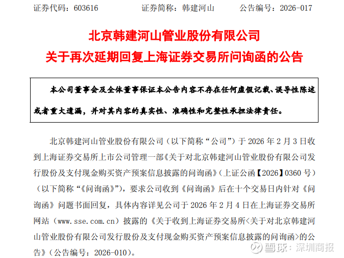 收到问询函后,韩建河山称高度重视并积极组织各方开展回复工作,但因部分问题的回复尚需补充和完善,公司首次向交易所申请延期回复,相关延期信息披露于2026年2月26日发布的公告编号2026-014的公告中。