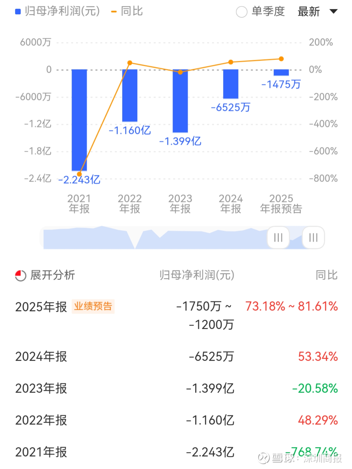 2025年,公司预计归母净利润亏损1200万元至1750万元,亏损同比收窄73.18%至81.61%;预计扣非净利润亏损2000万元至2550万元,亏损同比有所收窄。
