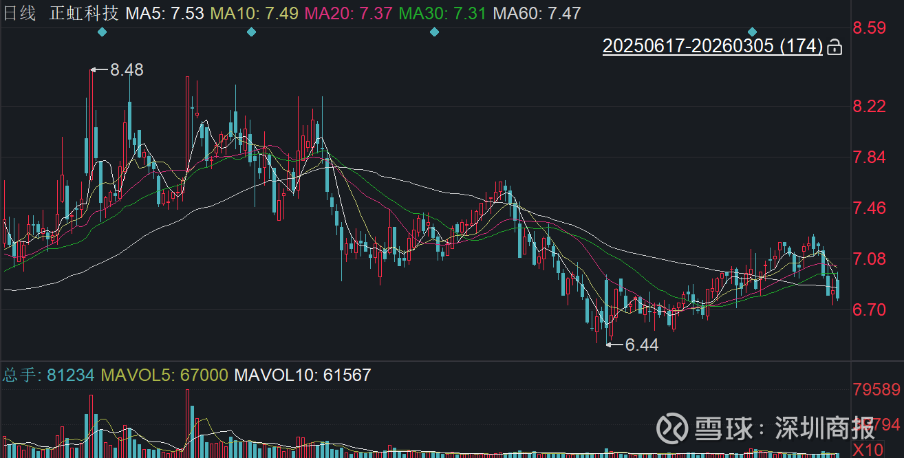 二级市场上,截至3月5日收盘,正虹科技下跌0.88%报6.78元/股,总市值约23.50亿元,近一年以来公司股价近乎“原地踏步”。