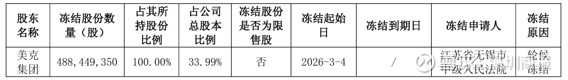 3月5日晚间,美克家居(SH600337)发布公告称,截至目前,公司控股股东美克投资集团有限公司(简称“美克集团”)所持公司股份已被全部轮候冻结,共计约4.88亿股,占公司总股本的33.99%。冻结的执行方为江苏省无锡市中级人民法院。