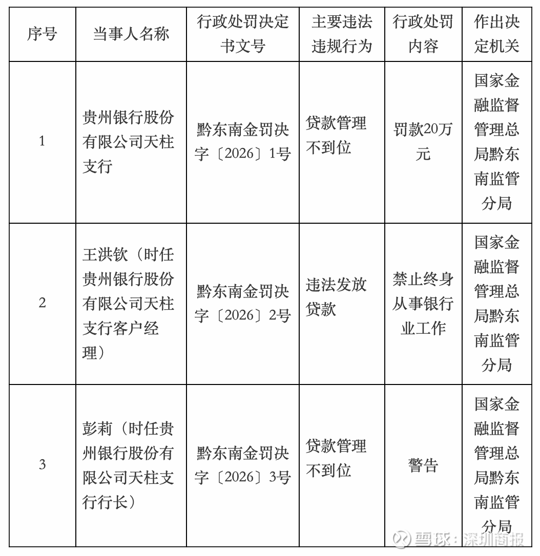 因贷款管理不到位,贵州银行股份有限公司天柱支行被罚款20万元,时任贵州银行股份有限公司天柱支行行长彭莉被警告。