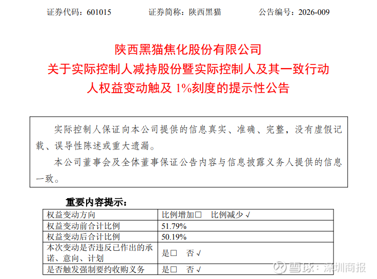 近日,陕西黑猫(601015)发布公告披露,公司实际控制人李保平于2026年3月4日通过大宗交易方式减持公司股份32,792,270股,减持比例达1.61%。此次减持后,李保平个人持股比例由3.92%降至2.32%,其与一致行动人合计持股比例由51.79%下降至50.19%。