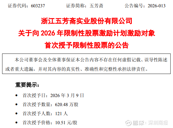 “粽子第一股”五芳斋(603237)3月9日晚发布公告,2026年3月9日,公司召开第十届董事会第五次会议,审议通过了《关于调整公司2026年限制性股票激励计划相关事项的议案》《关于向公司2026年限制性股票激励计划激励对象首次授予限制性股票的议案》。根据《浙江五芳斋实业股份有限公司2026年限制性股票激励计划(草案)》的规定和公司2026年第一次临时股东会的授权,董事会认为公司本激励计划规定的授予条件已经成就,同意确定2026年3月9日为授予日,授予121名激励对象620.48万股限制性股票;首次授予价格为10.51元/股。