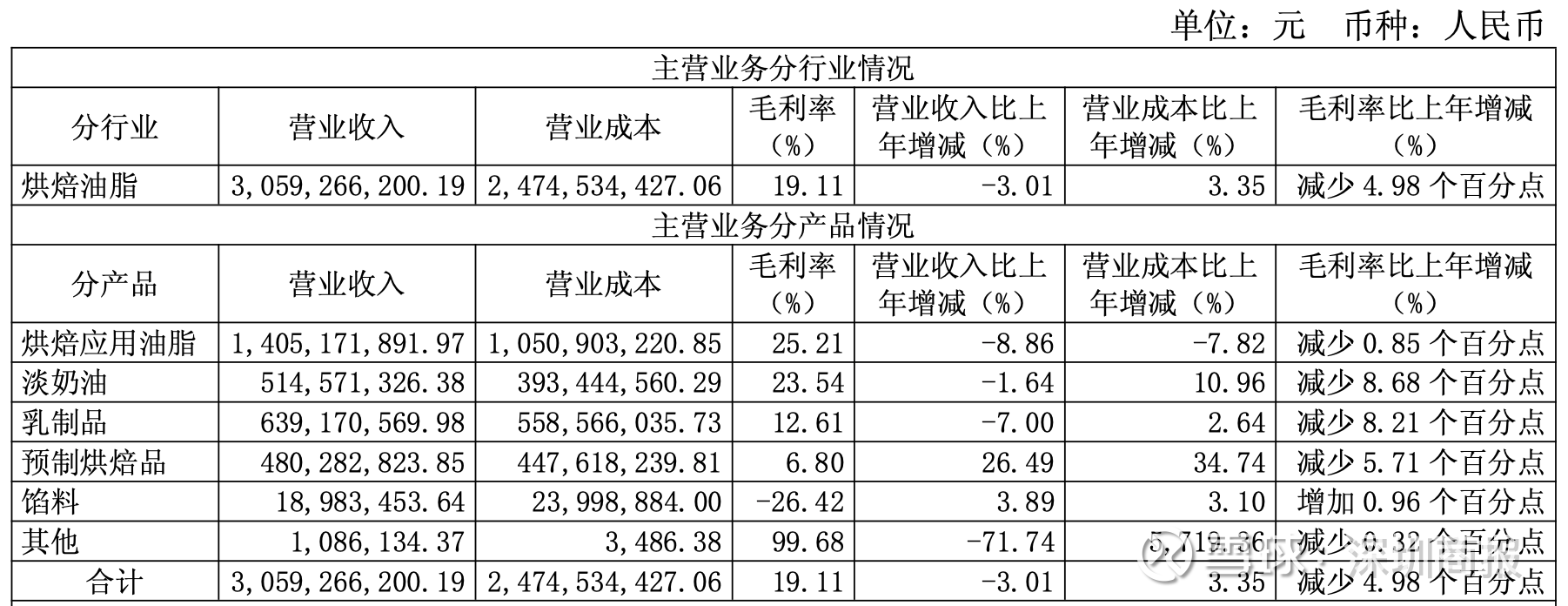 预制烘焙品营业成本同比增加34.74%,主要因为本期销量较上年同期增加及进口天然奶油成本同比上涨,同时,受产品结构改变、新品产能爬坡等因素影响,毛利率同比下降5.71个百分点。