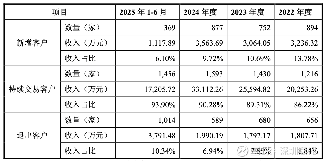 报告期各期,公司新增客户收入占比较低,持续交易客户收入占比较高,公司持续交易客户贡献的收入占比约90%。2022年度、2023年度、2024年度的退出客户数量及收入占比均较低;2025年1-6月因报告期仅有半年,故按照前述计算口径,当期退出客户数量相对较多。