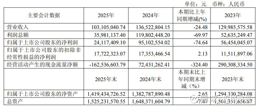 3月10日,汇通能源(600605)公布2025年年度报告,报告期内,公司实现营业总收入1.03亿元,同比下降24.48%;归母净利润2411.74万元,同比下降74.64%;扣非净利润1772.23万元,同比增长2.13%;经营活动产生的现金流量净额为-1.63亿元,上年同期为7243.13万元。