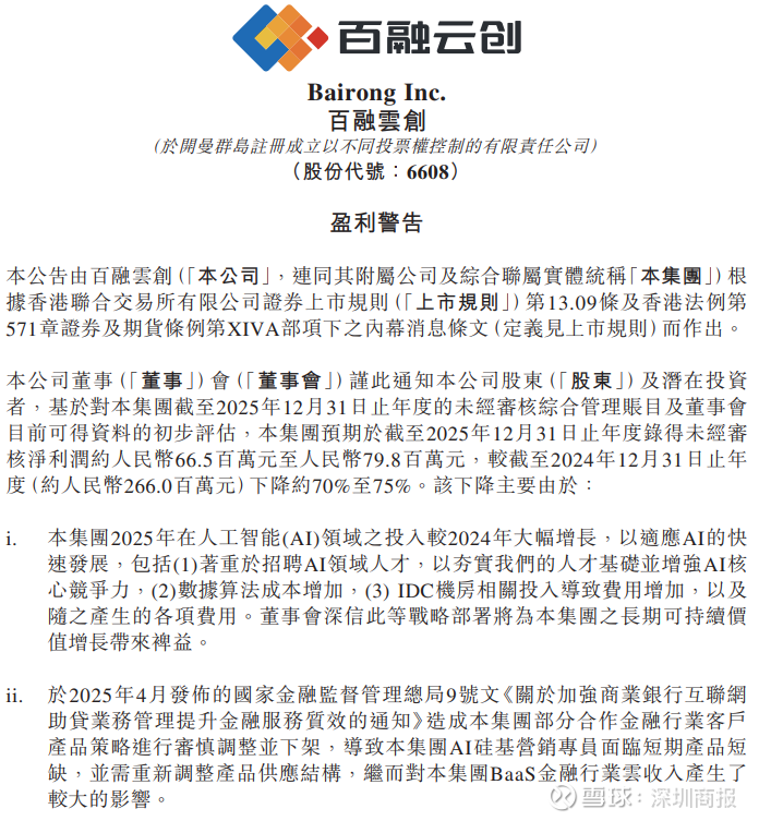 2月26日,百融云发布盈利警告,预计截至2025年12月31日止年度将录得未经审核净利润约6650万元至7980万元,较截至2024年12月31日止年度的约2.66亿元下降约70%至75%。