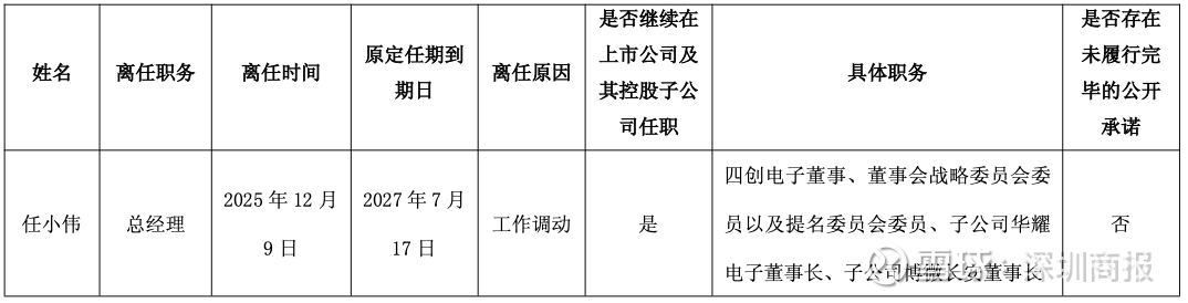 此前,四创电子2025年12月9日公告,公司总经理任小伟因工作调动申请辞去公司总经理职务,辞职后将继续担任公司董事、董事会战略委员会委员以及提名委员会委员、子公司华耀电子董事长、子公司博微长安董事长等职务。任小伟的辞职报告自送达董事会时生效。