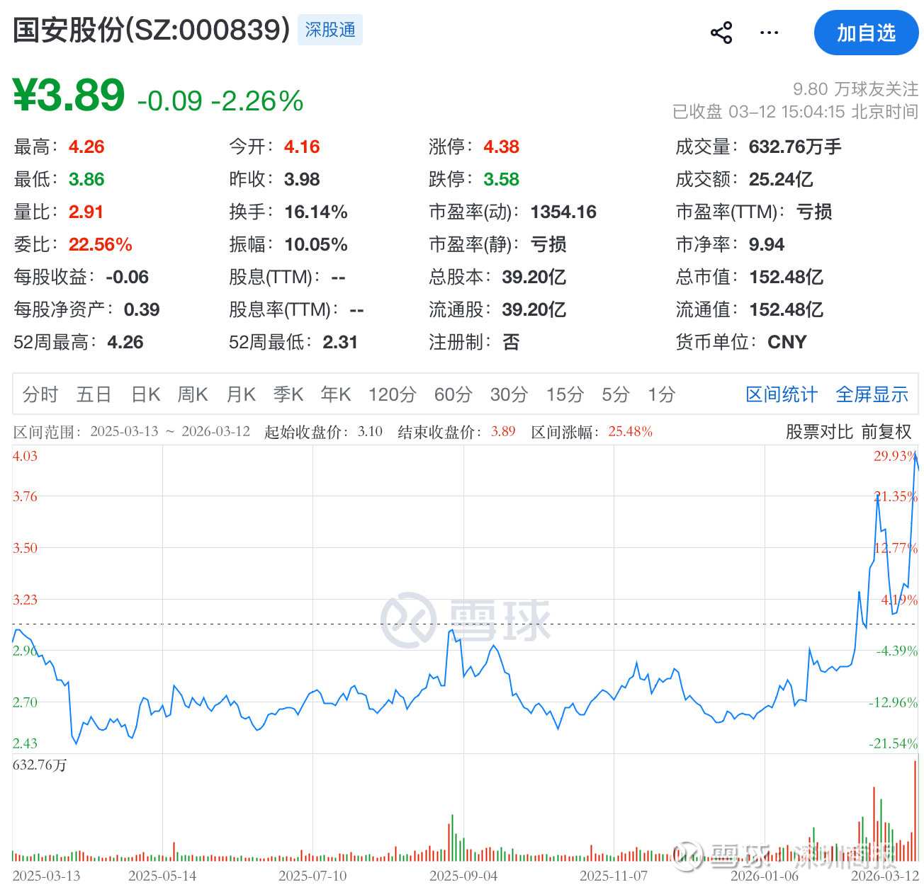 二级市场上,截至3月12日收盘,国安股份下跌2.26%报3.89元/股,总市值为152.48亿元。