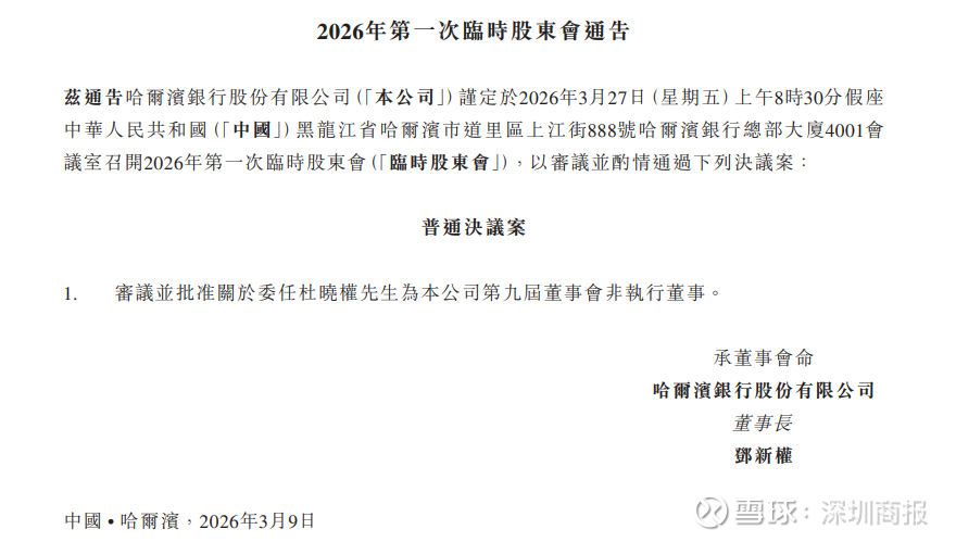 近日,哈尔滨银行(6138.HK)发布公告,公司将于3月27日召开2026年第一次临时股东会,审议关于委任杜晓权为公司第九届董事会非执行董事的议案。