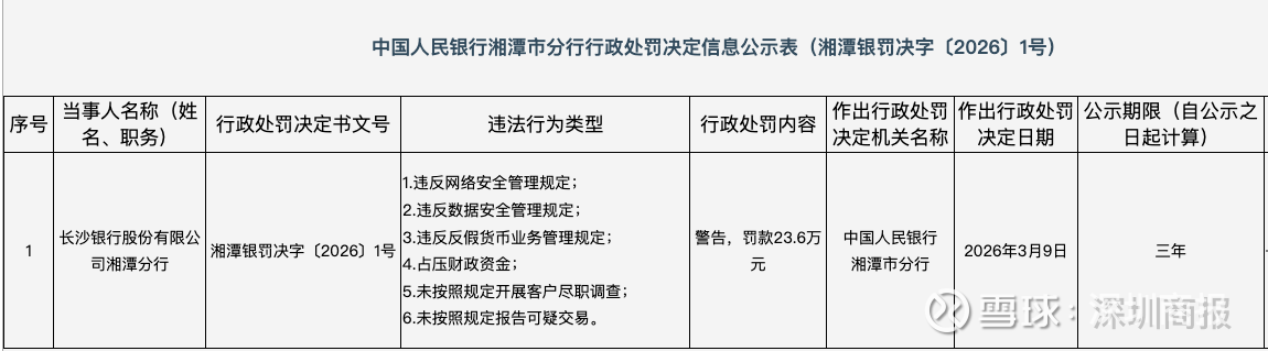 行政处罚决定信息公示表显示,长沙银行股份有限公司湘潭分行的主要违法违规事实包括:违反网络安全管理规定;违反数据安全管理规定;违反反假货币业务管理规定;占压财政资金;未按照规定开展客户尽职调查;未按照规定报告可疑交易。