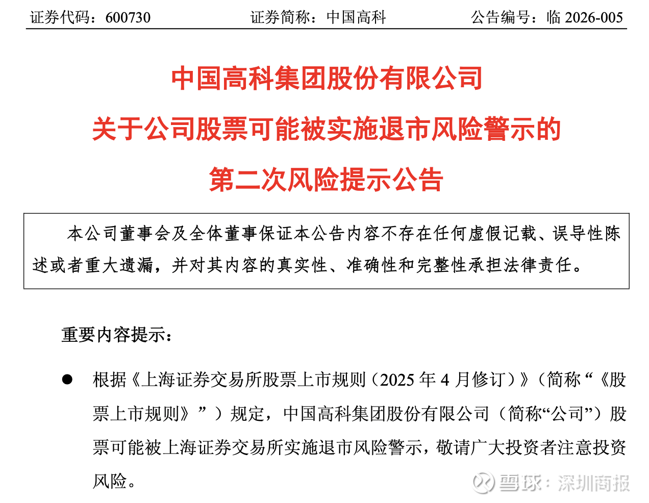 中国高科称,如公司经审计的2025年年度利润总额、净利润或者扣除非经常性损益后的净利润孰低者为负值且扣除与主营业务无关的业务收入和不具备商业实质的收入后的营业收入低于3亿元,公司股票将触及《股票上市规则》第9.3.2条第一款第一项规定的对公司股票实施退市风险警示的情形,公司股票在2025年年度报告披露后将被实施退市风险警示。