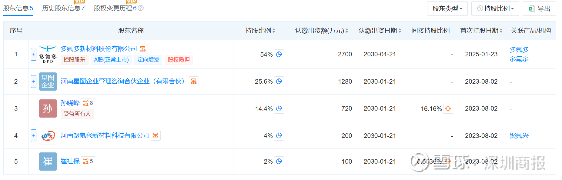 据天眼查APP,亿丰电子成立于2017年3月,注册资本5000万元,该公司由多氟多、河南星图企业管理咨询合伙企业(有限合伙)、河南聚氟兴新材料科技有限公司等共同持股。截至发稿,多氟多持股比例为54%,是该公司第一大股东。