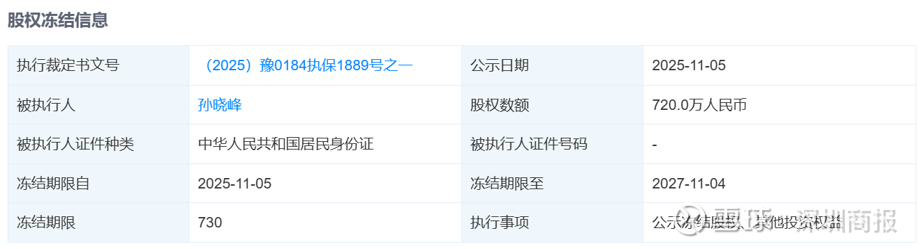 风险信息显示,亿丰电子存在一条股权冻结信息,股权数额为720万元,被执行人为最终受益股份达30.56%的法定代表人孙晓峰,冻结起止日期为2025年11月5日至2027年11月4日。