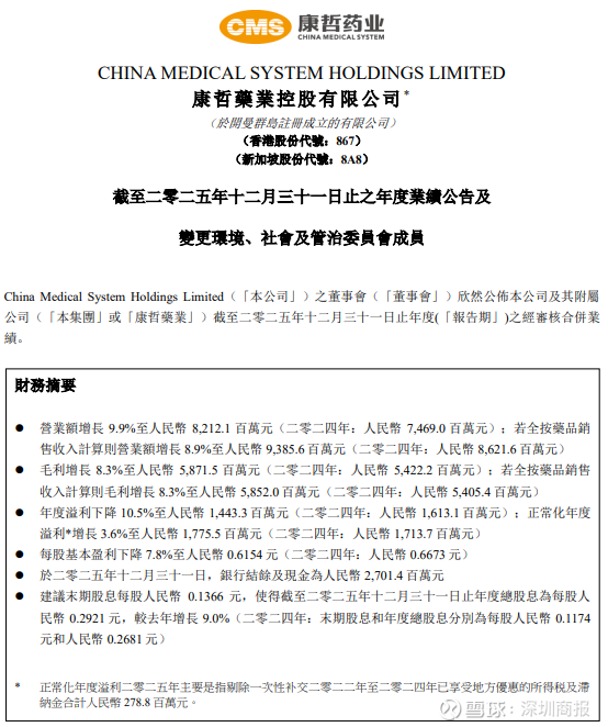 回望2025年,康哲药业已实现里程碑式的战略突破。未来,伴随“新康哲”战略的全面推进,集团将始终以创新为源动力,持续驱动院内外协同的多元商业化生态建设,加速“产业国际化”体系优势于新兴市场兑现,并将AI数智化赋能贯穿运营与管理。本集团正以卓越的发展韧性与战略张力,稳步成长为一家根植中国内地、竞逐全球新兴市场的创新驱动型国际化医药企业,为全球医药健康事业创造长远价值。