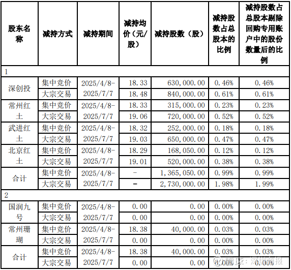 公司股东深创投、常州红土、武进红土、北京红土合计减持公司股份约285万股,减持股份占公司总股份为2.0663%。截至本公告披露日,在减持计划期间内,公司合计持有5%以上股份的股东国润九号、常州珊瑚未减持公司股份。