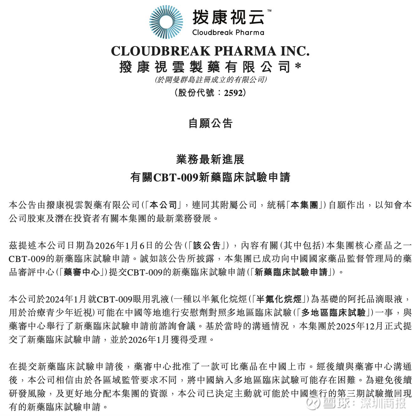 3月19日,拨康视云-B(02592)发布公告,公司于2024年1月就CBT-009眼用乳液(一种以半氟化烷烃(“半氟化烷烃”)为基础的阿托品滴眼液,用于治疗青少年近视)可能在中国等地进行安慰剂对照多地区临床试验(“多地区临床试验”)一事,与药审中心举行了新药临床试验申请前咨询会议。基于当时的沟通情况,集团于2025年12月正式提交了新药临床试验申请,并于2026年1月获得受理。