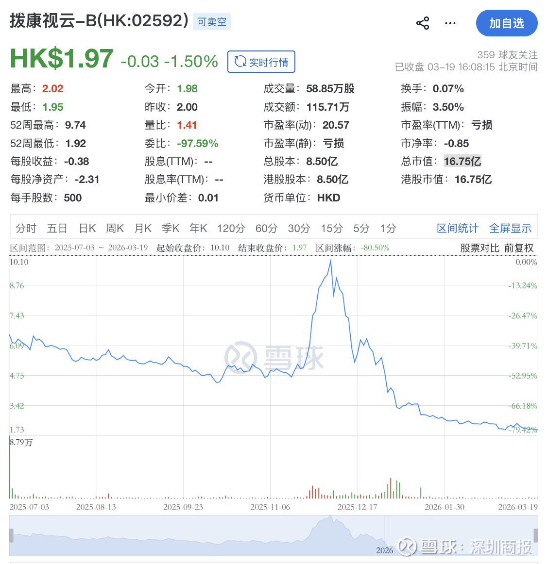 2025年7月3日,拨康视云在港交所上市,其发行价10.1港元/股,截至3月19日收盘,该股股价已跌至1.97港元/股,上市至今股价跌去八成。