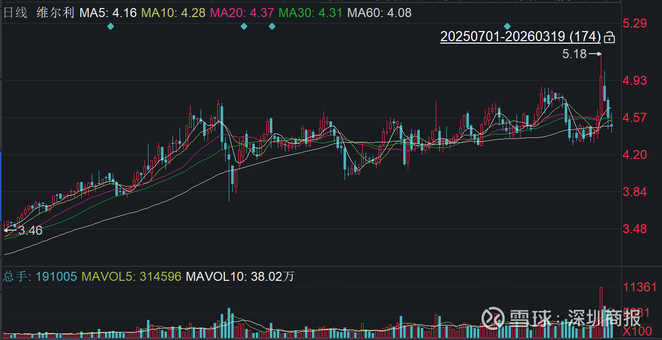 二级市场上,截至3月19日收盘,维尔利下跌1.97%报4.47元/股,总市值约41.10亿元,近一年公司股价累计上涨约三成。