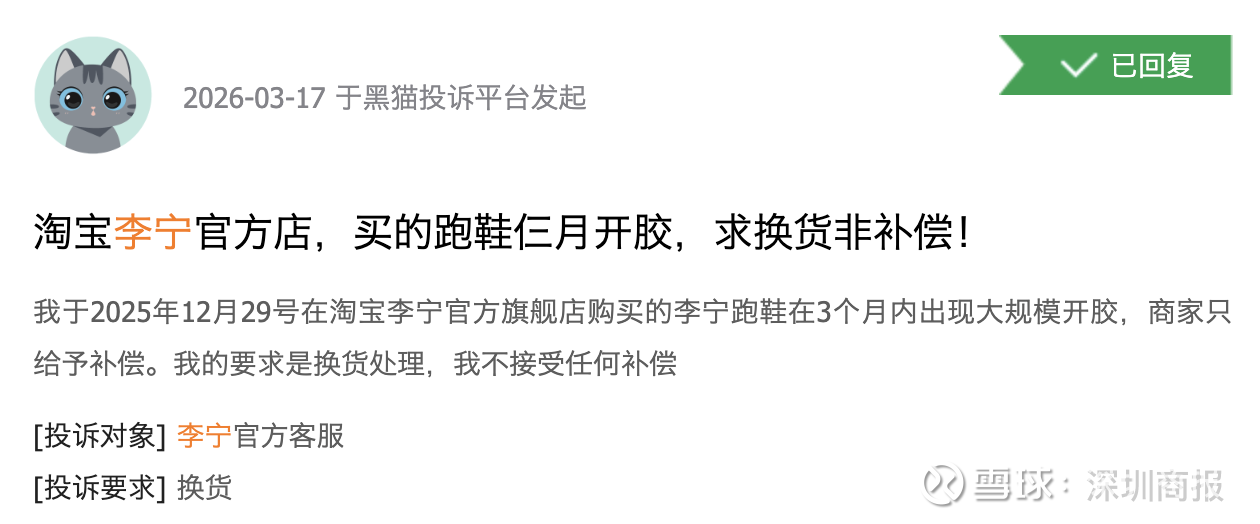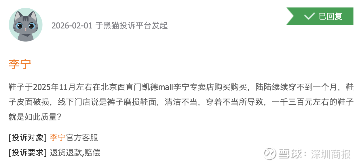 黑猫消费者投诉平台上,有近2万条投诉中包含搜索词“李宁”,且近期有多条关于产品质量差的投诉,包括“鞋子穿了不到一个月便有破损”“跑鞋穿了三个月便开胶”等。