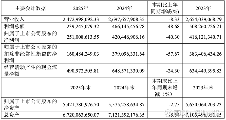 报告期末,公司资产总额为672,006.37万元,归属于上市公司股东的净资产为542,178.10万元,与2024年年末数相比分别减少5.64%和2.75%。