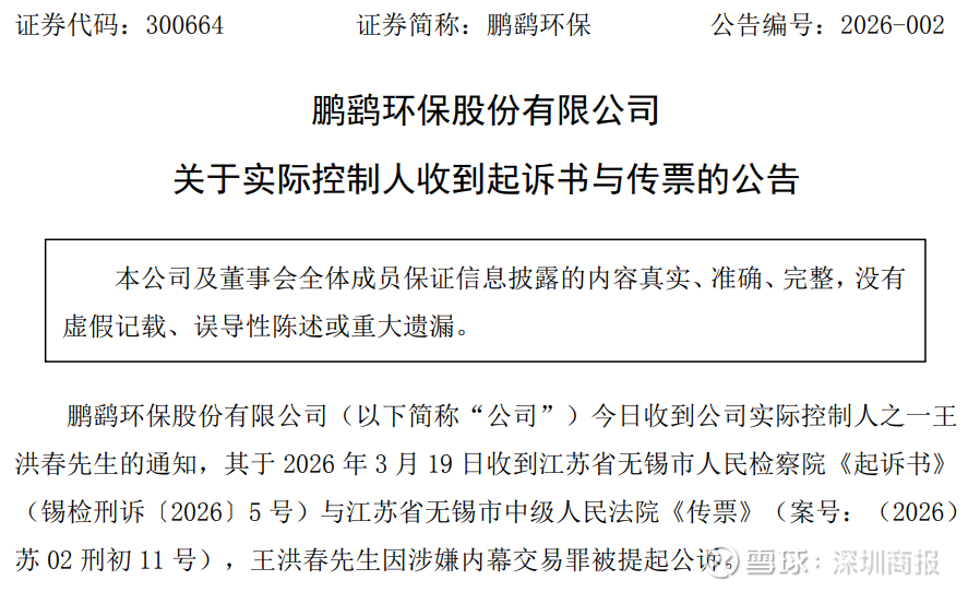 3月20日晚间,鹏鹞环保(300664)公告,公司3月20日收到公司实际控制人之一王洪春的通知,其于2026年3月19日收到江苏省无锡市人民检察院《起诉书》与江苏省无锡市中级人民法院《传票》,王洪春因涉嫌内幕交易罪被提起公诉。