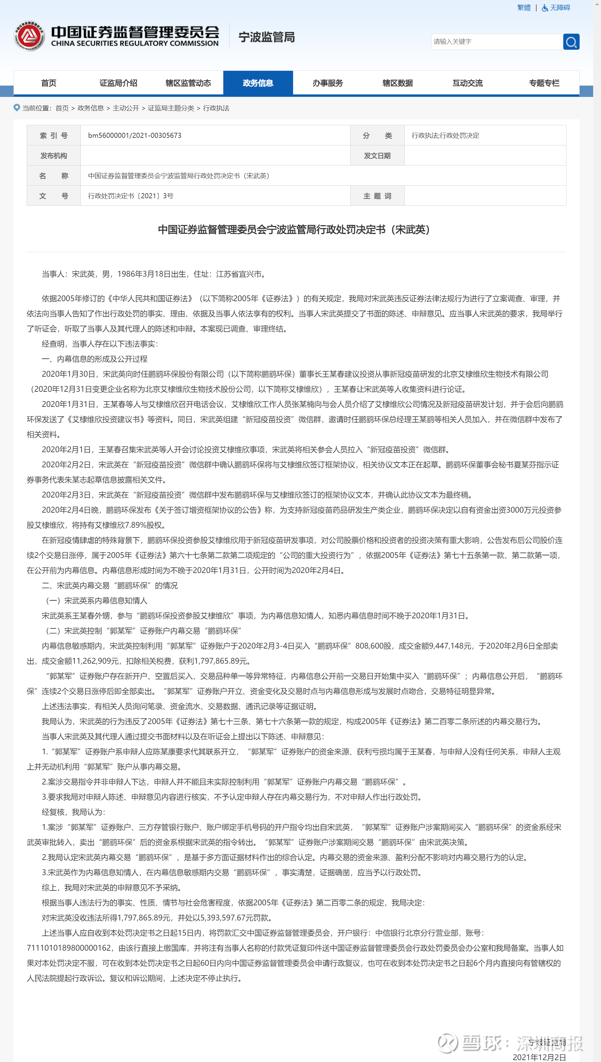 综上,宁波证监局对宋武英的申辩意见不予采纳。根据当事人违法行为的事实、性质、情节与社会危害程度,依据2005年《证券法》第二百零二条的规定,宁波证监局决定:对宋武英没收违法所得1,797,865.89元,并处以5,393,597.67元罚款。
