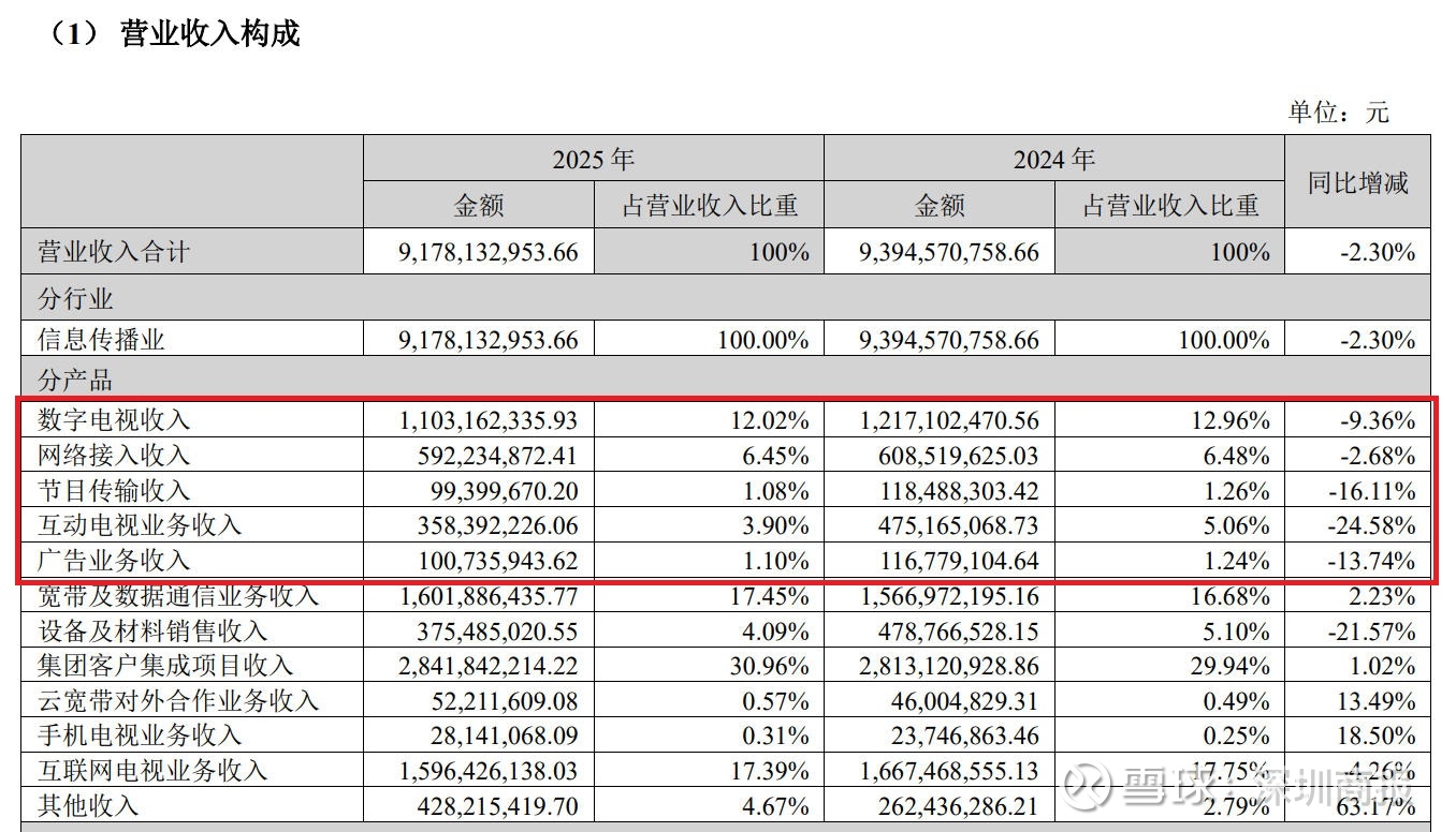 年报反映,分产品看,该公司2025年度的数字电视收入、网络接入收入、节目传输收入、互动电视业务收入、广告业务收入分别同比上年下降了9.36%、2.68%、16.11%、24.58%和13.74%。