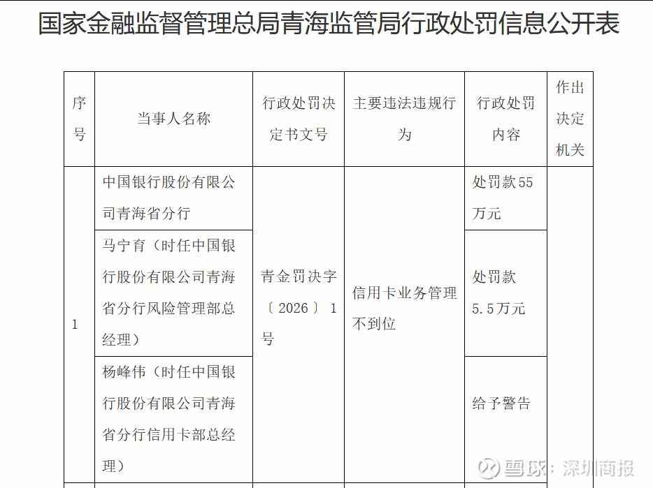 3月20日,青海金融监管局行政处罚信息公开表显示,中国银行青海省分行因信用卡业务管理不到位被处罚款55万元 。同时,马宁育(时任中国银行青海省分行风险管理部总经理)因信用卡业务管理不到位 ,被处罚款5.5万元 ;杨峰伟(时任中国银行青海省分行信用卡部总经理)因信用卡业务管理不到位 ,被 给予警告 。