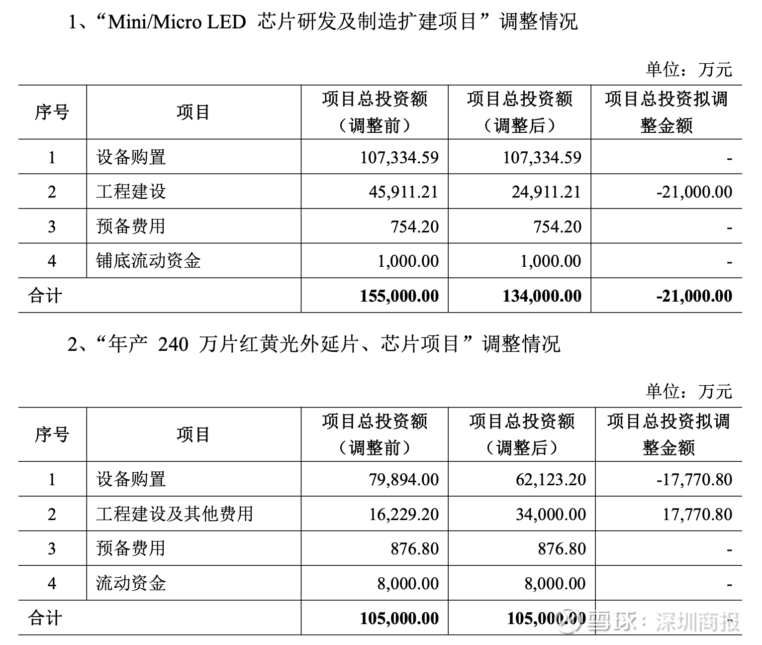 公司在募集资金投资项目实施主体、募集资金投资用途及募集资金投资总额不变的情况下,调整募投项目“Mini/Micro LED芯片研发及制造扩建项目”“年产240万片红黄光外延片、芯片项目”的内部投资结构。