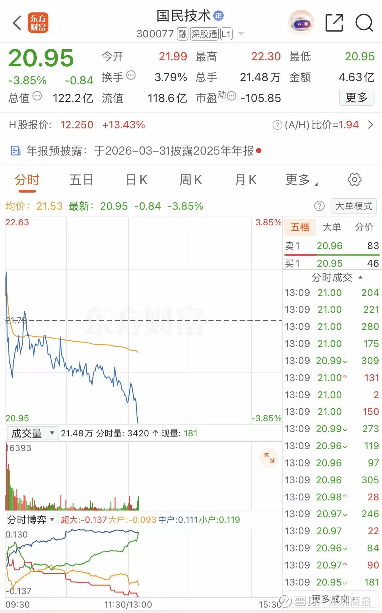 国民技术已在A股上市,不过其A股股价今日走势不佳,截至发稿跌超3%,报20.95元/股,总市值为122.2亿元。