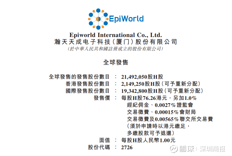 日前,瀚天天成(02726.HK)发布公告,公司计划全球发售2149.205万股H股,招股期为3月20日至3月25日,每股发售价定为76.26港元,每手买卖单位为50股,募资总额达16.39亿港元,预计将于3月30日正式在港交所上市。