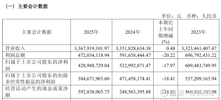 翻阅过往年报,公司自2024年起,业绩一直呈现营收的持平与净利下滑态势。2024年,公司营收33.52亿元,同比增长0.85%,净利润5.23亿元,同比下滑14.19%。2025年,公司营收33.68亿元,同比增长0.48%,净利润4.29亿元,同比下滑17.97%。