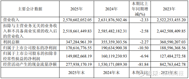 3月23日,连云港(601008)披露2025年年度报告。2025年,公司实现营业总收入25.71亿元,同比下降2.33%;归母净利润1.71亿元,同比下降10.50%;扣非净利润1.49亿元,同比下降6.94%;经营活动产生的现金流量净额为2.78亿元,同比下降81.84%;报告期内,连云港基本每股收益为0.14元,加权平均净资产收益率为4.14%。公司2025年度分配预案为:拟向全体股东每10股派现0.6元(含税)。