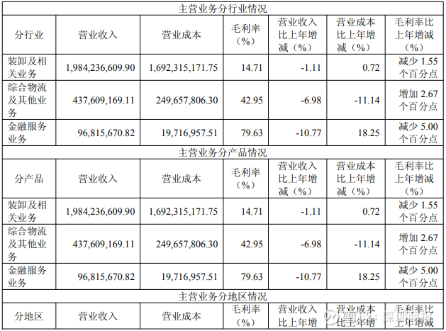 报告期内,公司装卸及相关业务、综合物流及其他业务、金融服务业务营业收入分别较上年减少1.11%、6.98%、10.77%。装卸及相关业务毛利率比上年减少1.55个百分点,综合物流及其他业务比上年增加2.67个百分点,金融服务业务比上年减少5.00个百分点。