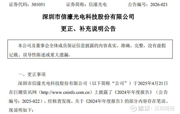 近日,信濠光电(301051)突然对2024年年报进行了更正与补充。根据公告,其2024年年报中出现了多处笔误。