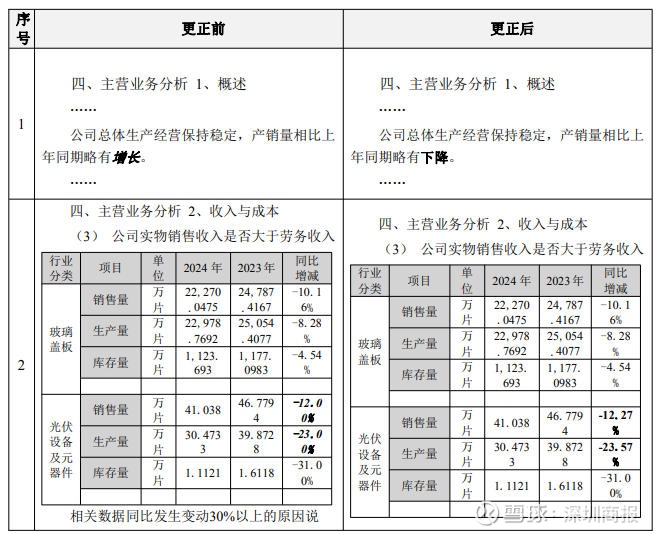 例如,在主营业务分析中,信濠光电将“公司总体生产经营保持稳定,产销量相比上年同期略有下降。”写成了“公司总体生产经营保持稳定,产销量相比上年同期略有增长。”光伏设备及元器件的产销量同比增减数值出现了错误。