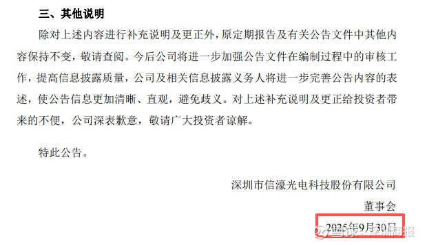2025年9月30日,信濠光电公告,公司于2023年7月3日在巨潮资讯网上披露了《关于对外投资收购股权及增资的进展公告》,经核查发现,关于2023年5月23日相关公告的引用存在笔误。
