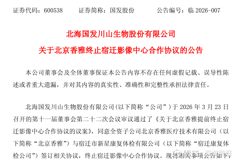 曾被国发股份(600538)视为公司转型医疗领域重要布局的宿迁影像中心项目,在历经近八年的运营后,最终以累计亏损1577万元、设备折价转让的结局黯然收场。公司于3月23日召开董事会,正式宣告终止这一合作。