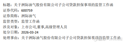 3月24日,根据上交所发布的公告,洲际油气(600759)收到了监管工作函,关于子公司贷款担保事项。涉及对象包括公司、董事及高级管理人员。