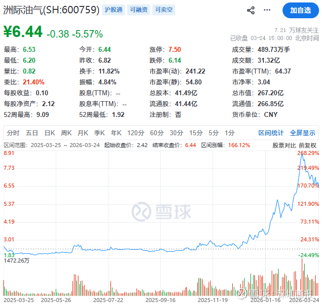 二级市场上,截至3月24日收盘,洲际油气下跌5.57%报6.44元/股,最新市值267.20亿元。