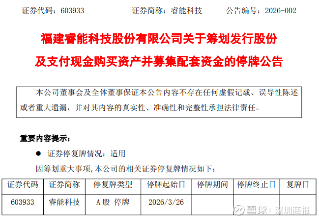 3月25日晚间,睿能科技(603933.SH)公告称,公司正在筹划通过发行A 股股份和支付现金相结合的方式收购博泰智能装备(广东)有限公司(以下简称“博泰智能”或“标的公司”)不超过75%的股权,以取得其控制权,并募集配套资金(以下简称“本次交易”)。鉴于事项存在不确定性,为维护投资者利益,公司股票自2026年3月26日起停牌,预计停牌不超过10个交易日。