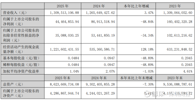 这是归母净利润连续三年下滑。其中,2023年同比减少21.31%、2024年同比减少45.82%、2025年同比减少48.84%。